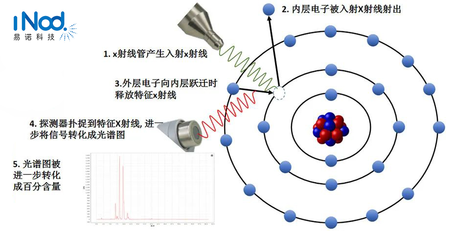 奧林巴斯手持式光譜儀的試樣中被測元素的原子受到來自于X射線管的一次X射線激發而引起內層電子的躍遷,同時發射出具有一定能量的X 射線二次熒光,利用高性能(能量分辨率<170eV)的X 射線硅漂移SDD檢測器探測試樣中被測元素所發出的各種能量的特征X 射線,根據檢測器輸出信號的能量大小和強度來對被測元素進行定性和定量分析。