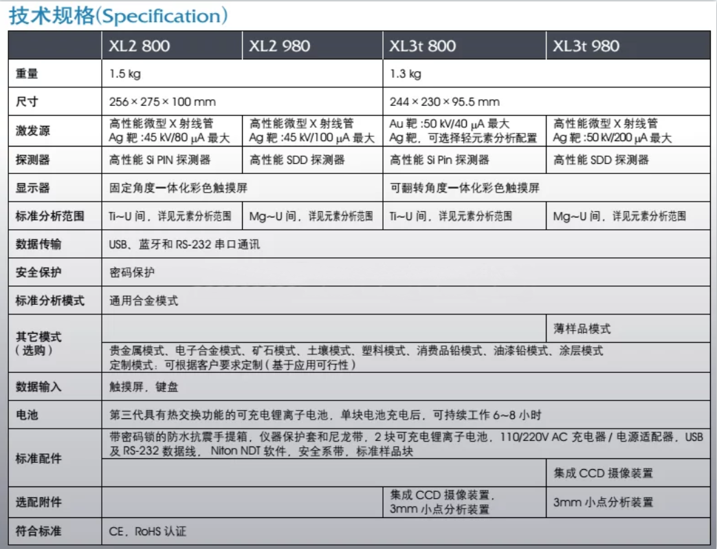 元素檢測范圍:從鈦到鈾之間的元素,以及鎂(Mg)、鋁(Al)、硅(Si)、硫(S)和磷(P)等輕量元素