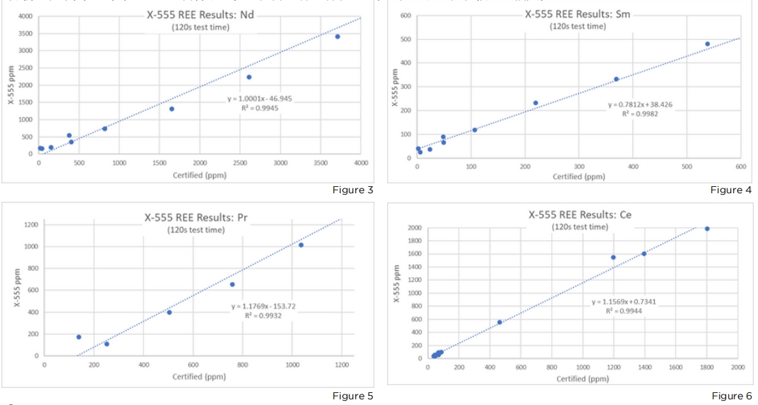 X-555具有特殊的屏蔽能力和3mm直徑的光束準直性,可直接用于巖石表面和巖芯。它還可以配備一個聯鎖試驗臺,用于袋裝或袋裝樣品的安全分析。在下圖3-6中,X-555對各種認證參考材料的研究結果顯示,它們與認證值有很好的相關性。