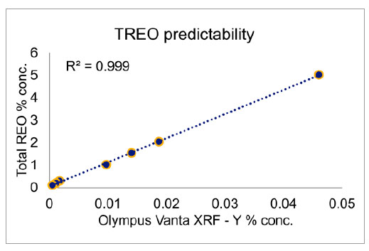 圖3. Vanta手持式XRF光譜儀基于所測到釔的含量可以準(zhǔn)確預(yù)測總稀土氧化物的含量。
