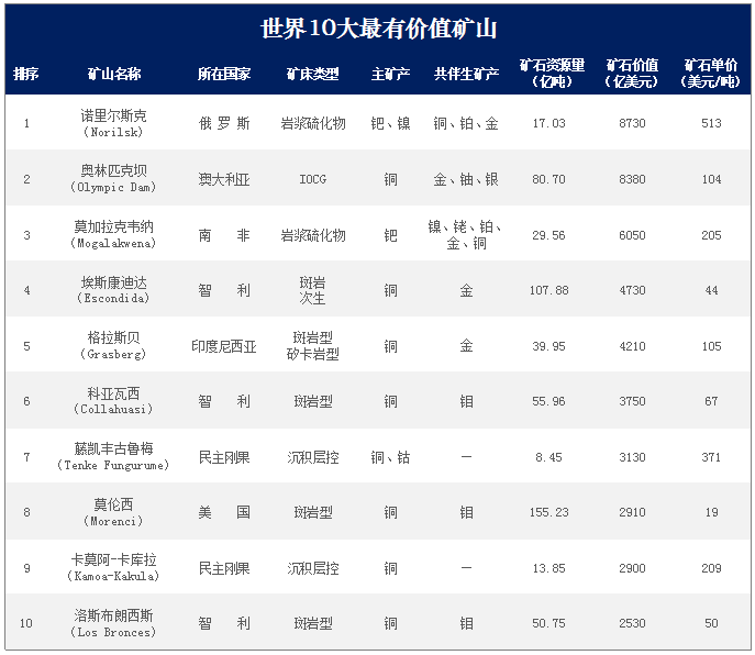 利用關(guān)聯(lián)公司礦業(yè)情報(bào)(MiningIntelligence)的數(shù)據(jù),按照現(xiàn)行價(jià)格,Mining.com網(wǎng)站計(jì)算了礦山資源總價(jià)值,并列出了世界10大在產(chǎn)賤金屬和貴金屬礦山。