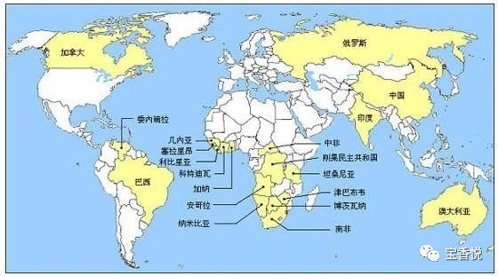 南亞和南美、非洲是彩色寶石的主要產地,特別是緬甸、巴西、斯里蘭卡、馬達加斯加、俄羅斯、加拿大等國,擁有數種寶石的頂級礦藏,占世界寶石資源分布總量的95%以上。著實令人羨慕,而資源比較貧乏的區域有歐洲、格陵蘭、北美東部和西非。