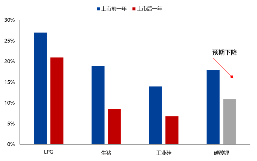 據(jù)相期貨公司預(yù)測,參考最近三年新增的品種LPG、生豬和工業(yè)硅,上市后歷史波動率均值較之前明顯下降。最近一年電池級碳酸鋰歷史波動率均值為18%,期貨上市后預(yù)計逐步下降至11%左右。