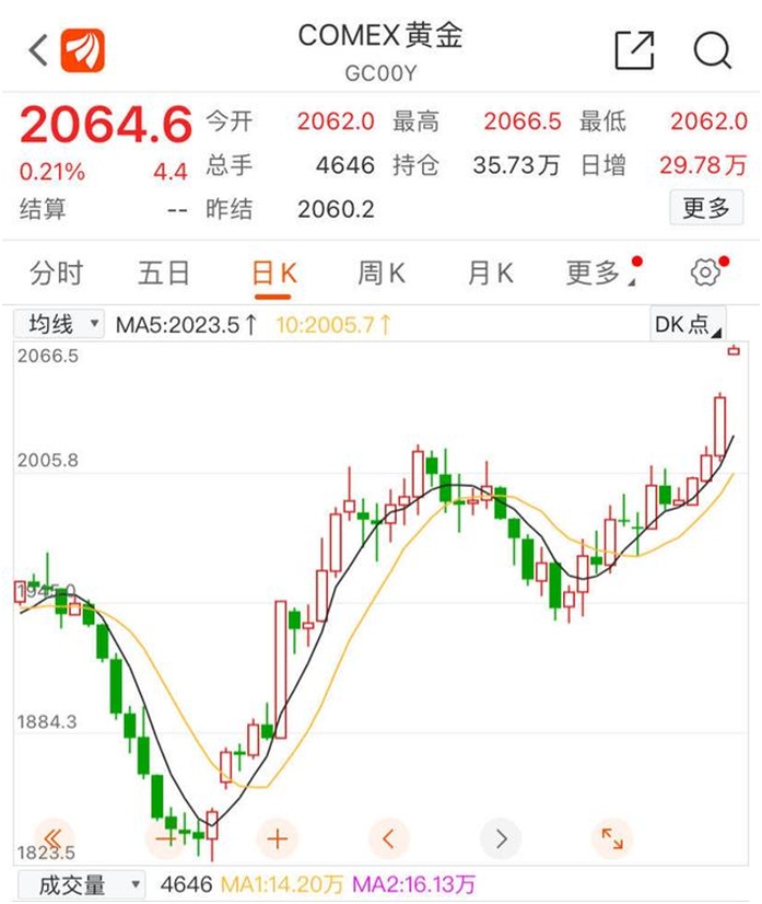 繼上周五國際金價突破2000美元關口后,11月29日紐約商品交易所COMEX12月黃金期貨持續收漲,截止29日八點,該指數暫報2064.7美元,連漲四日且創5月中旬以來的半年新高,也越來越逼近2080美元的歷史最高。