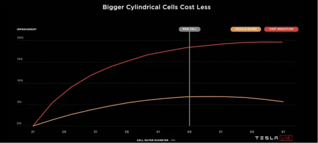 相比方形電池,圓柱電池在封裝為電池包時,圓柱與圓柱之間會有縫隙,空間利用率比較低,圓柱體積的增大可以減少縫隙,有研發人員指出,車用圓柱電池直徑控制在45- 50 毫米時能最好地兼顧電池容量和空間利用率,特斯拉在經過多方實驗,遍歷所有關鍵指標,發現46mm是成本最小的電池外徑,直徑 46 mm、高 80 mm,是最完美的圓柱電池比例。
