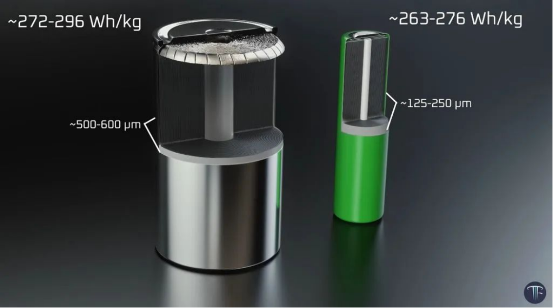 外形增大,減少了電池包中的單體電池數量,降低殼體在單位電池容量上的占比,結構件和焊接數量也顯著減少,與2170電池相比,成本降低了14%。同時,電池組中金屬外殼占比減少,正極、負極等材料占比增加,能量密度提高。