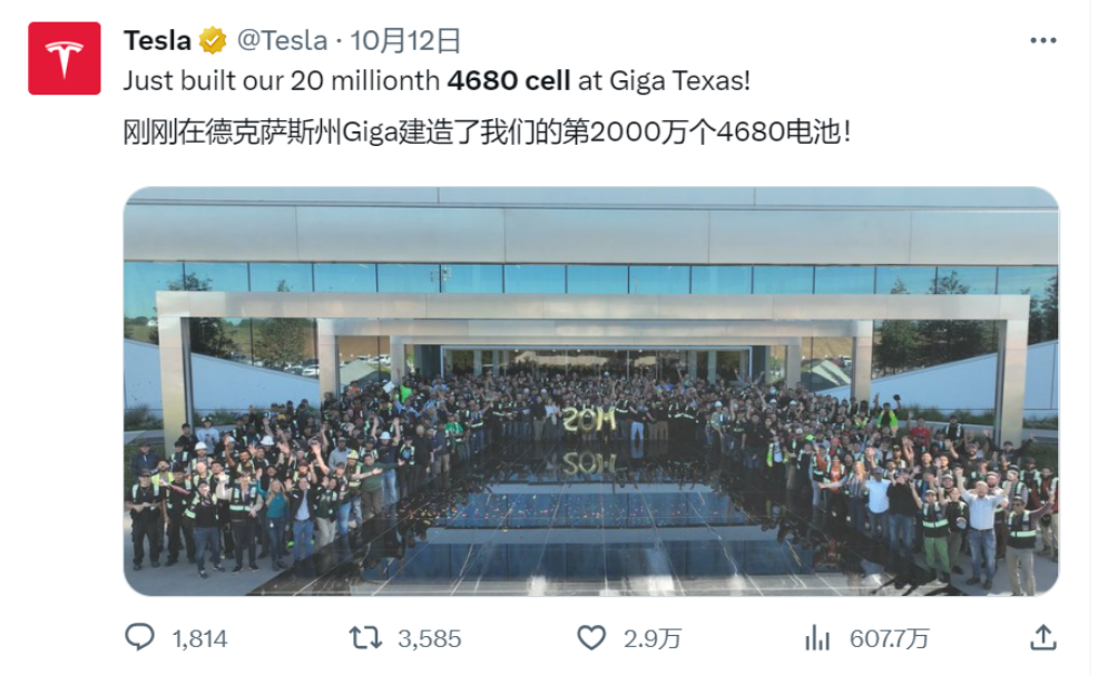 在不少質疑聲中,特斯拉終于在今年10月份官宣其德州超級工廠在4680電池的生產上取得了重大突破,該工廠生產了第2000萬塊電池。而6月份特斯拉剛宣布其德州工廠生產了第1000萬塊4680電池,用4個月將產量翻番,這無疑是巨大的進步。