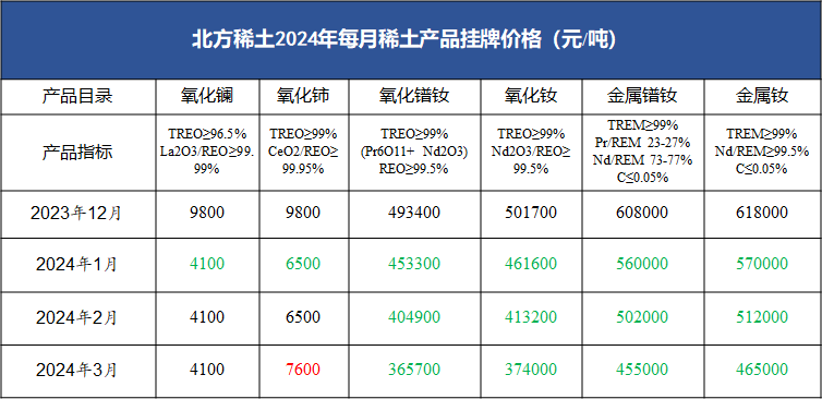 北方稀土2024年Q1掛牌價格