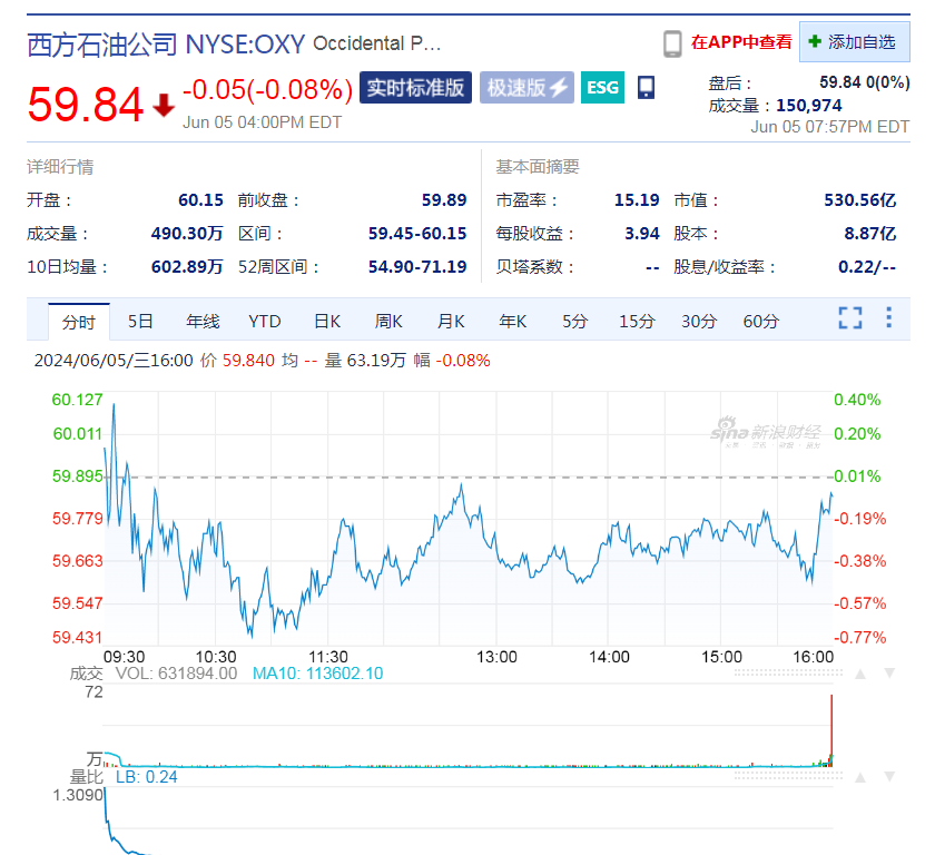 西方石油公司收?qǐng)?bào)59.84美元,跌幅0.08%,市值530.56億美元。