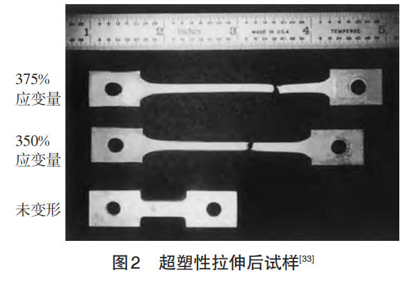 TROEGER等對6000系合金的超塑性研究表明,500 ℃以上時合金表現(xiàn)出超塑性。在 540 ℃應變速率為2×10-4~5×10-4 /s時,應變速率敏感性達到最大值0.5 /s。應變速率為5×10-4 /s時合金的單向拉伸延伸率最大達375%,對應的流變應力為4.7 MPa,如圖2所示。周義等用鋁合金以超塑性成形方式進行了汽車前擋泥板成形試驗,在成形溫度控制在450~500 ℃、最大脹形壓力達到0.42 MPa的條件下,試驗取得成功,整個成形時間為 30~60 min。梁繼業(yè)等以 5083 鋁合金為研究對象對車門的鋁合金外板的正反脹超塑性成形工藝進行了研究,在480 ℃和應變速率為 1×10-3 /s 條件下,最大伸長可達到242%。雖然超塑性成形時間比一般成形工藝時間長,但在成形時材料塑性流動的阻力非常小,即使是復雜件也可以一次成形,因而其應用前景非常廣泛。