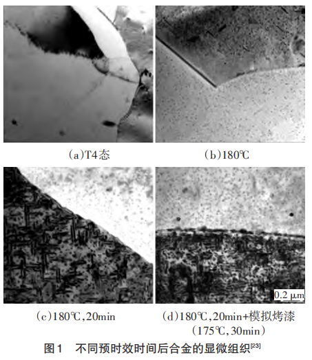 熱處理后鋁合金板材的最終性能受溫度、時間因素的影響。鋁合金退火時,板材的抗拉強度隨退火溫度的升高而降低。淬火時板材的抗拉強度、伸長率隨淬火加熱溫度的升高而增加。進行時效熱處理時,隨著時效熱處理保溫時間延長,板材的抗拉強度升高,電導率逐漸增加,但保溫到一定時間時出現(xiàn)峰值后開始下降。熱處理工藝對鋁合金板材的力學性能和應力腐蝕敏感性有影響,2519鋁合金板材經(jīng)先高溫后低溫的雙級時效處理(180 ℃×3 h+145 ℃×24 h)后力學性能最好,但抗應力腐蝕性能最差;經(jīng)形變熱處理(20 ℃×100 h+預變形15%+145 ℃×21 h)后的力學性能較好,抗應力腐蝕性能最好;過時效狀態(tài)(180 ℃×30 h)下力學性能最差,抗應力腐蝕性能適中。2000 系鋁合金的屈服強度比較高,熱處理進行自然時效時其屈服強度進一步增加,之后的成形難度增加。在自然時效前,對其進行短時間的預時效,能夠抑制隨后時效過程中 GP 區(qū)的形成,降低自然時效的硬化效果,同時提高合金的應變硬化指數(shù)和延伸率,從而提高合金板材的成形性,如圖1所示。6022鋁合金在 500~560 ℃進行固溶處理時,晶粒大小基本不變,而第二相數(shù)量顯著減少,超出該溫度范圍后晶粒粗化。560 ℃固溶處理后自然時效可獲得最佳力學性能。時效前進行預時效,能有效抑制自然時效的不良影響并提高模擬烤漆后的烤漆性能。