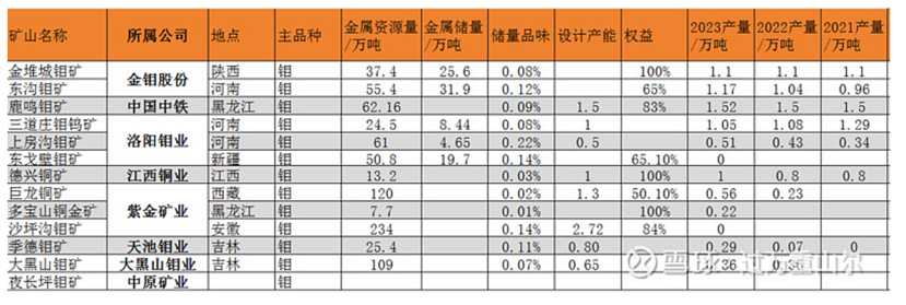 從企業來看,國內鉬礦相關有金鉬股份、洛陽鉬業、中國中鐵(鹿鳴礦業)、江西銅業(德興銅礦)、紫金礦業(巨龍銅礦、沙坪溝鉬礦、多寶山銅礦)等,上述5家企業2023年合計產量約7.16萬噸,約占國內市場的65%。金鉬股份是國內最大的鉬礦開采及鉬產品生產商,擁有陜西的金錐城鉬礦與河南的東溝鉬礦兩個核心礦山,產能都在一萬噸左右。