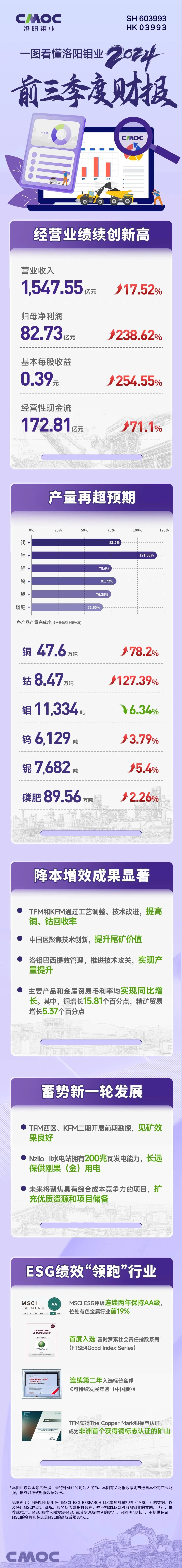 10月28日,洛陽鉬業公布的最新財報顯示:今年前三季度,公司實現營業收入1547.55億元,同比增長17.52%;歸屬于上市公司股東的凈利潤超越2023年全年業績,達到82.73億元,同比增長238.62%;基本每股收益0.39元,同比增長254.55%。