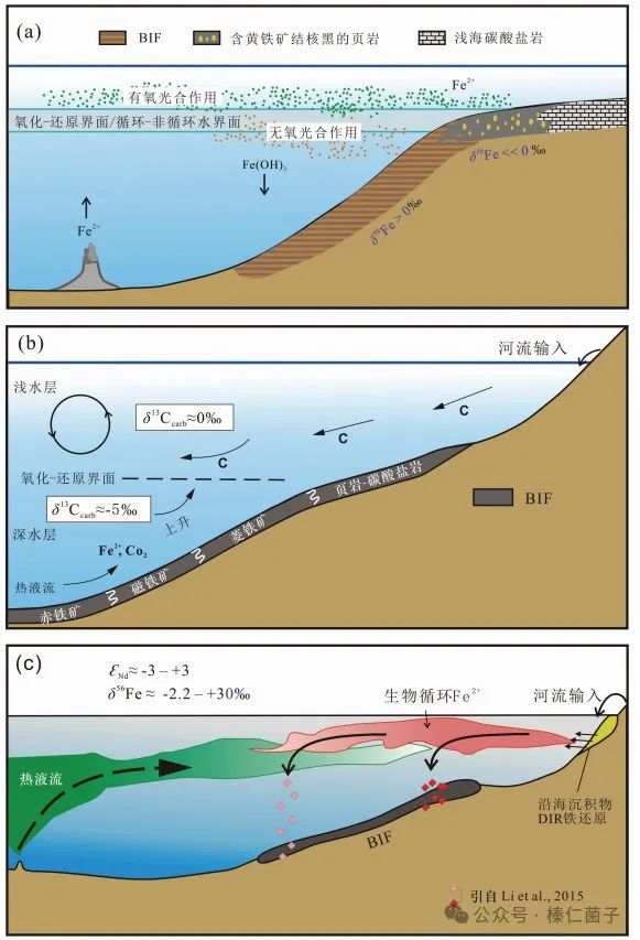 礦床的形成是自然界的選礦、富集過程。鐵比較重要的一個特點是二價鐵如硫酸鐵、氯化鐵等等是溶解于水的,氧化形成的三價鐵是不溶解于水的。“條帶狀赤鐵礦(磁鐵礦)”就是在特定的地質歷史時期、地質環境中因為鐵元素的這個特點形成的。