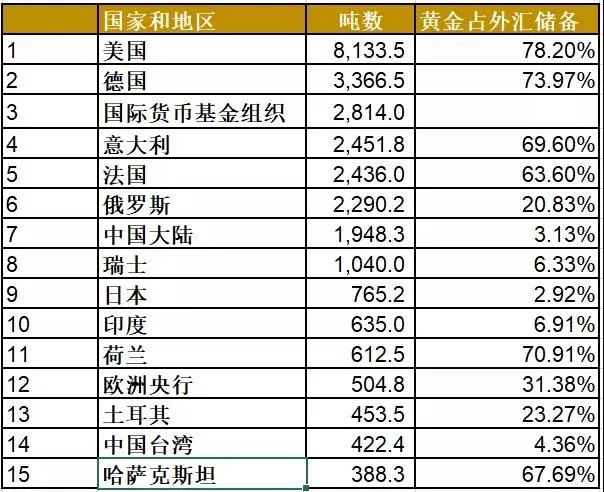 截至2020年2月,全球前十五官方黃金儲備數據一覽: