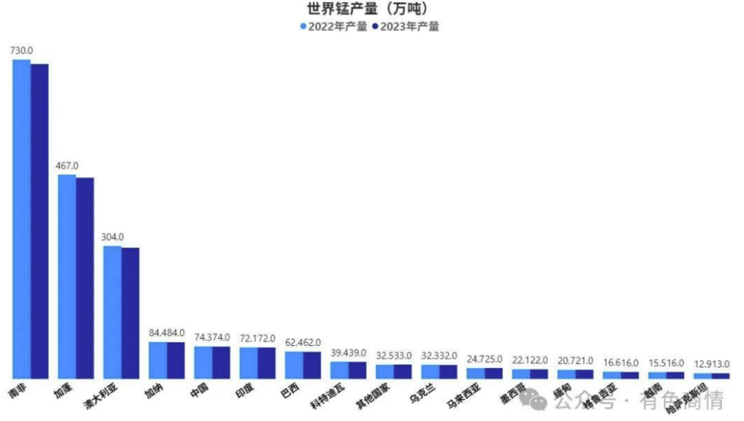 中國錳礦儲量2.8億噸,排名全球第三位,這些錳礦資源主要集中于南方地區,像廣西、湖南、云南、貴州、重慶、湖北等省區是我國錳礦資源的主要聚集地。然而,我國錳礦資源在品位方面存在明顯短板,平均品位約為21%,富礦(氧化錳礦 Mn>130.00%、碳酸錳礦石 Mn≥25.00%)僅占全國總儲量的 6.43%,貧錳礦卻占到了 93.60%。
