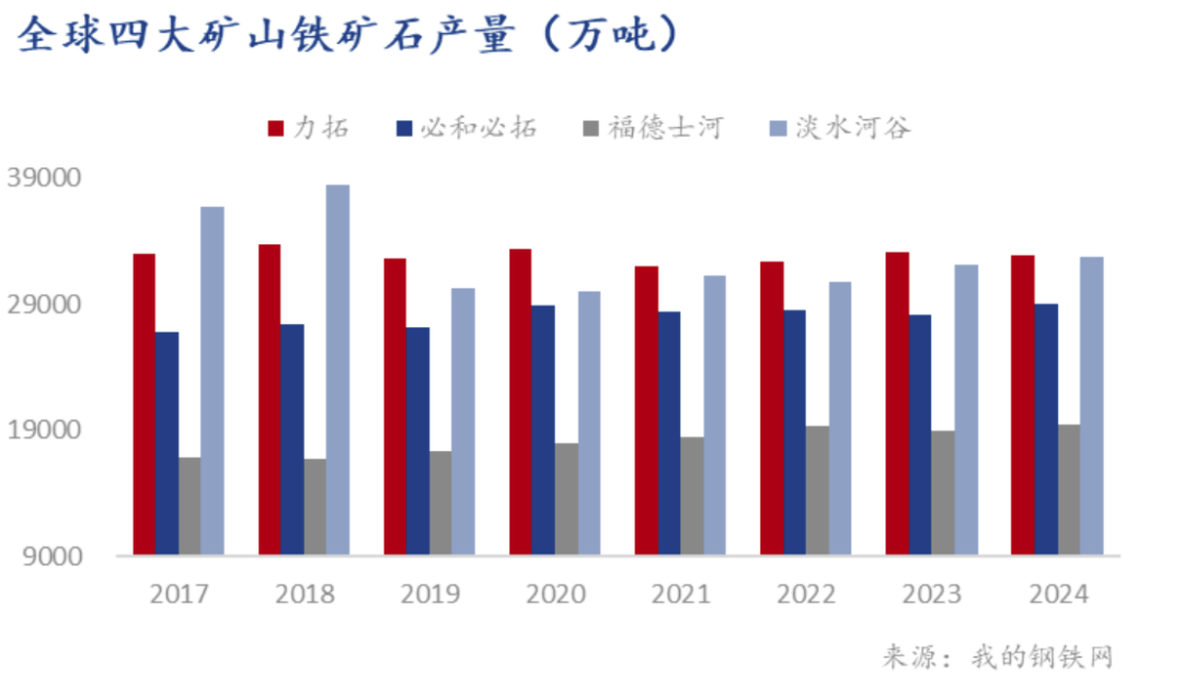 據(jù)統(tǒng)計,四大礦山2024年鐵礦石總產(chǎn)量達(dá)11.39億噸,同比增加1600萬噸,增幅1.4%。具體來看,澳大利亞三大礦山巨頭表現(xiàn)相對平穩(wěn),合計產(chǎn)量超過8億噸,同比增長930萬噸,而巴西的淡水河谷表現(xiàn)則相對突出,淡水河谷2024年鐵礦石產(chǎn)量達(dá)到3.28億噸,同比增加652萬噸,超過原定的3.1-3.2億噸指導(dǎo)目標(biāo),創(chuàng)下2018年以來的新高。同時,淡水河谷全年鐵礦石銷量實現(xiàn)了約3.07億噸,同比增長4.02%,達(dá)到了2019年以來最好的銷量數(shù)據(jù)。