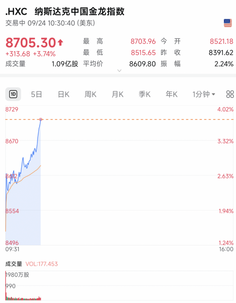 截至收盤,納斯達克中國金龍指數收漲2.83%,熱門中概股普漲。