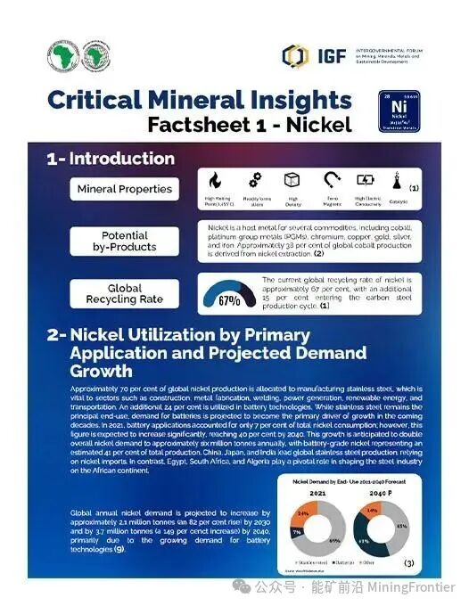 非洲豐富的礦產資源能夠推動工業增長,但由于開采活動占據主導地位,而增值活動有限,其巨大潛力仍未得到充分開發。這些由非洲礦業論壇 (IGF) 和非洲開發銀行聯合編寫的出版物,深入分析了鎳、銅、鈷、鋰、鋁土礦、天然石墨、鐵礦石、錳、磷酸鹽、釩、鉑族元素和稀土元素等礦產資源。